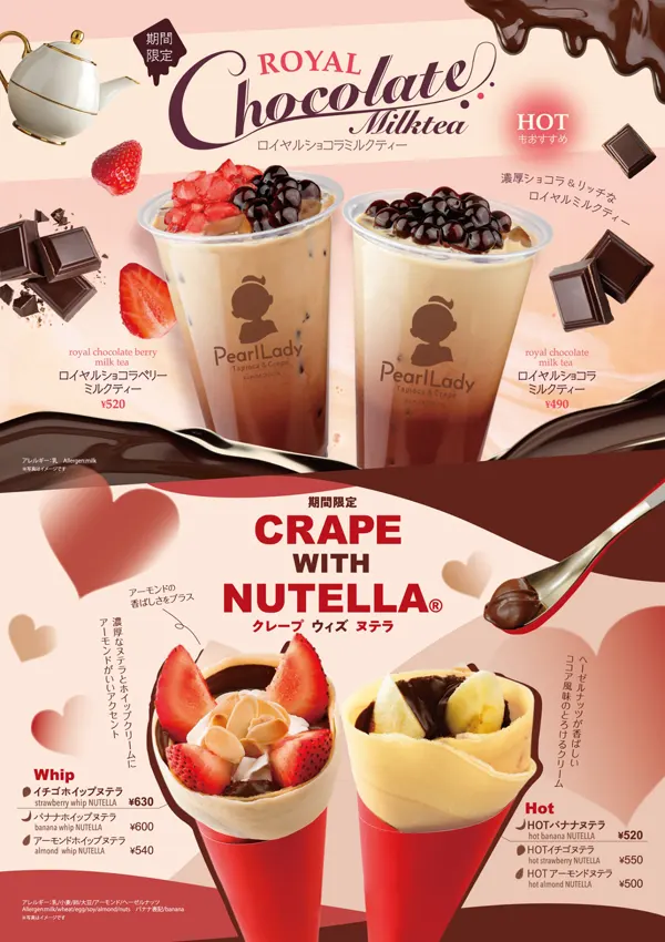 パールレディの冬メニューは濃厚なロイヤルショコラミルクティーとヌテラを使用したクレープが登場♪